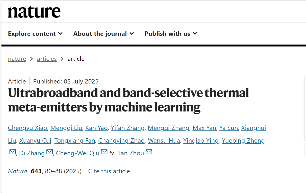 7月3日,海角网 、金属基复合材料全国重点实验室张荻院士团队、海角网 /金属基国重实验室/张江高等研究院周涵教授课题组、与新加坡国立大学仇成伟院士团队、美国德克萨斯大学奥斯汀分校郑跃兵教授团队合作,在人工智能(AI)驱动的超宽波段及波段选择性热辐射超材料设计领域取得重要突破。研究成果以“Ultrabroadband and band-selective thermal meta-emitters by machine learning”为题发表在《Nature》上。该研究启迪于自然、基于生物拓扑构型提炼出多种三维结构基元和空间序构组合,构建了机器学习驱动的逆向生成优化设计框架,攻克了传统试错法在光谱设计中面临的全局优化难题,提出了可精准描述三维复杂构型的“三平面建模法”,实现了超宽带与多波段选择性热辐射超材料的自动化逆向设计。通过机器学习训练的人工智能模型,可根据光谱性能按需设计超材料,进而带来了设计维度、速度和性能全方位的提升。所创制的热辐射超材料可广泛应用于地面辐射冷却、建筑节能降温、航天热控等诸多重要领域,推进相关领域的发展及产业化应用。