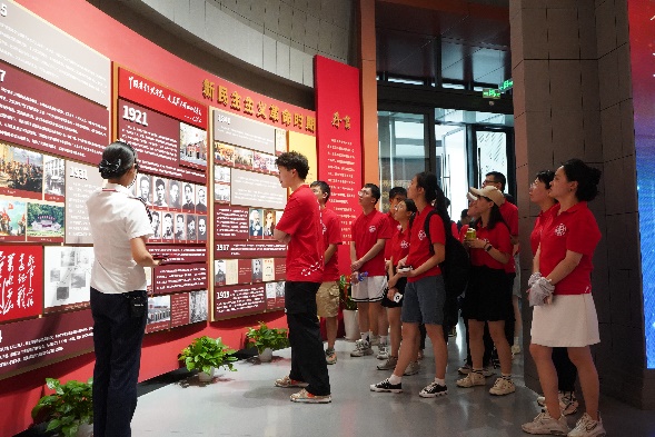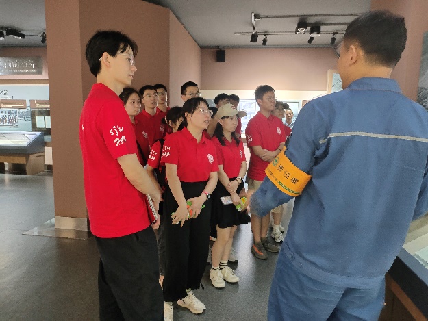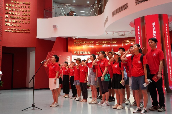 随后,王彦杰和夏培培带实践团一行参观了宝钢股份党性教育智慧体验中心和宝钢历史陈列馆。在党性教育智慧体验中心,大家聆听着讲解员声情并茂的解说,依次走过“初心如磐”“使命在肩”“强基固本”“勇立潮头”四个展厅,了解我国钢铁事业发展之路,面向党旗重温入党誓词,学习宝钢“百人百事”先进榜样事迹,感悟钢铁人代代传承的不变初心和钢铁强国的坚定决心。在宝钢历史陈列馆,大家通过图文、实物及影像资料深入了解宝钢从决策建设至工程投产的创业之路,为当时全国人民建宝钢的情景所打动,为工人们抓紧每分分秒秒学习的精神所鼓舞,为宝钢从追赶到引领的跨越式发展所振奋。
