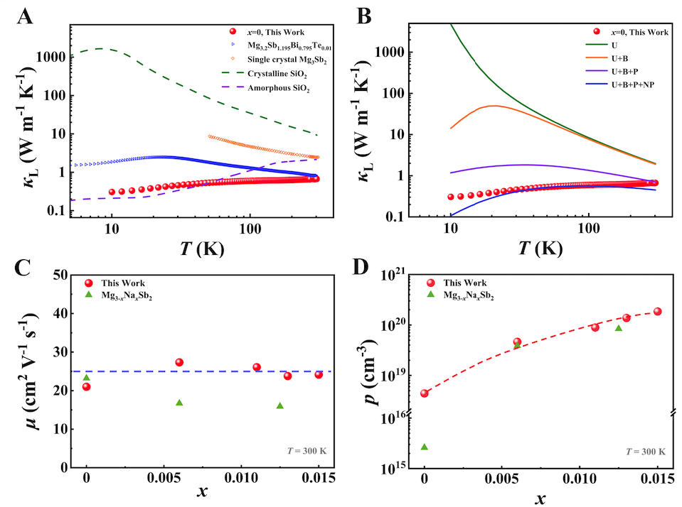 图4 高熵材料电热输运性能。(A) (Mg0.94-nYb0.26Sr0.26Znm)(MgnCd0.69Zn0.69-m)(Sb1.74Ca0.26)样品的低温晶格热导率κL随温度的变化关系。采用多晶Mg3.2Sb1.195Bi0.795Te0.01、单晶Mg3Sb2、晶态SiO2和非晶SiO2的数据进行比较。(B) 不同声子散射机制对晶格热导率κL的贡献。U、B、P和NP分别表示声子-声子Umklapp过程、晶界散射、点缺陷散射和纳米粒子散射。(C) 高熵样品的室温迁移率随Na含量的变化曲线;(D) 高熵样品的载流子浓度随Na含量的变化曲线