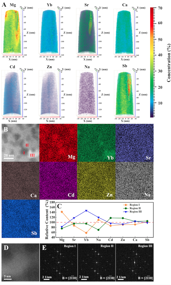 图2 高熵材料在纳米尺度的成分起伏。(A)利用三维原子探针技术(APT)获得的(Mg0.94-nYb0.26Sr0.26Znm)(MgnCd0.69Zn0.69-mNa0.013)(Sb1.74Ca0.26)样品三维重构图,显示了 Mg、Yb、Sr、Ca、Cd、Zn、Na 和 Sb 元素浓度的变化;(B)高角度环形暗场(HAADF)图像以及相应的能谱(EDS)面扫图;(C)图3B中暗色区域I、灰色区域II和白色区域III中不同元素的相对含量。红色虚线表示各元素的相对平均含量;(D)放大的HAADF图像;(E)图 3B中三个不同区域的快速傅立叶变换(FFT)图像。