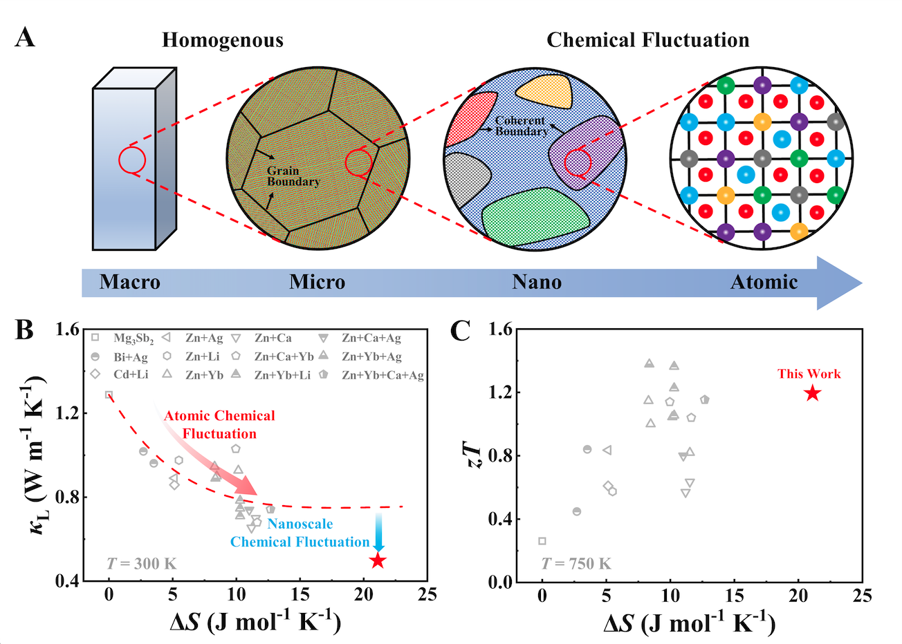 图1 具有多尺度成分起伏的高性能Zintl相热电材料。(A) 高熵材料中原子至纳米尺度成分起伏示意图;(B) 高熵样品的室温晶格热导率κL随构型熵ΔS的变化关系。红色虚线表示通过Callaway模型计算得出的理论晶格热导率;(C) 样品在750 K下的热电优值zT与构型熵ΔS。图中包含了已报道的p型Mg3Sb2基热电材料的性能数据以供比较。