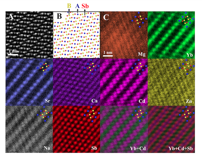 图3 高熵材料在原子尺度的成分起伏。(A)高熵样品(Mg0.94-nYb0.26Sr0.26Znm)(MgnCd0.69Zn0.69-mNa0.013)(Sb1.74Ca0.26)的原子尺度HADDF-STEM图像;(B) Zintl相AB2Sb2的原子结构模型;(C)各种元素的原子尺度STEM-EDS图像。每张图的右上角添加了AB2Sb2的原子结构模型,以标定原子占位情况。