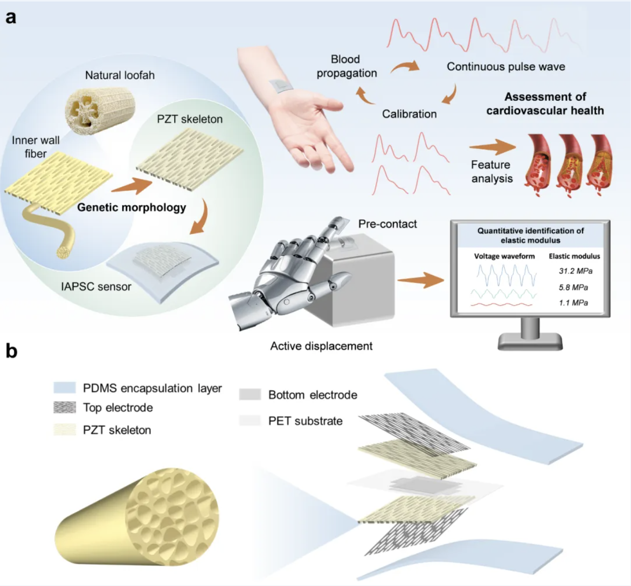 针对现有压电聚合物及压电复合材料在柔性-灵敏度-稳定性协同优化以及多向力感知方面的技术瓶颈,本研究以天然丝瓜内壁纤维为模板,利用简单的溶胶-凝胶法制备了具有多尺度互连结构的锆钛酸铅(PZT)压电陶瓷骨架,并进一步开发出了一体化的各向异性压电传感器(IAPSC sensor),其在面外压缩和弯曲模式下均表现出优异的传感能力。研究表明微观三维互连的贯通孔道结构可显著提高应力传递效率,器件在面外压缩模式下兼具低检测限(0.2 kPa)、宽传感范围(0.2-325.6 kPa)和高灵敏度(241.12 mV/kPa)。而宏观各向异性的网状结构则赋予了器件高压电各向异性和优异的可拉伸性(45%拉伸应变),实现了对弯曲变形大小和方向的同步识别。同时对称式一体化的设计使柔性器件在30万次压缩和弯曲循环后仍能保持稳定。该传感器被成功应用于人体心血管健康评估和物体弹性模量的定量识别,在健康监测和机器人智能感知领域展现出巨大应用潜力。该研究丰富了遗态材料的多样性,为功能陶瓷的结构设计提供了一种新的方法。