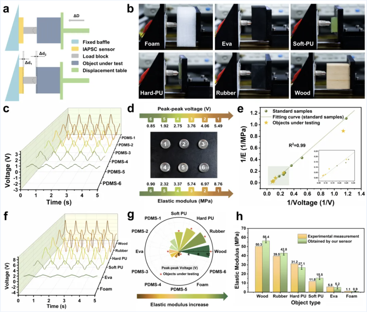 基于传感器的压电响应机制,开发了一种物体弹性模量的定量识别策略。通过测试具有不同弹性模量物体的动态电压响应信号,可以计算出弹性模量。传感器的高灵敏度使其可以分辨物体微小的模量差异。且计算结果与实验结果一致性良好。