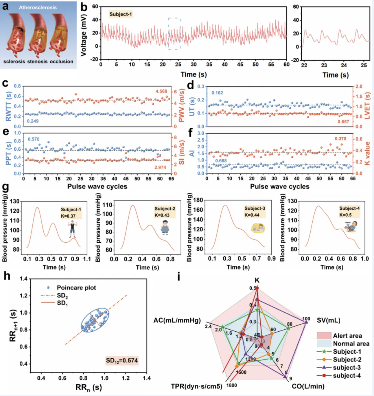 利用该传感器对不同个体桡动脉脉搏波进行长时间监测,采集压电脉搏波。由于传感器具有出色的灵敏度和工作稳定性,可以采集到人体标准的脉搏波信号(三段波)。采用特征参数法对脉搏波特征进行提取和分析,并结合定标后的血压波对不同个体的心血管参数进行计算和分析,最后对四名个体的心血管健康状况进行评估。例如,个体3的心输出量(CO)和搏动量(SV)偏高,血管弹性(AC)偏低,但血流阻力(TPR)正常,表明其心脏泵血功能异常且存在轻度动脉硬化,基于压电脉搏波的评估结果与个体实际病症吻合度高,表明该传感器在心血管疾病早期筛查和预防方面有巨大应用潜力。