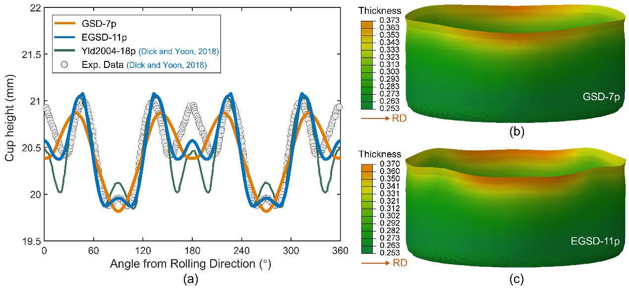 根据实验参数的数量,团队基于GSD框架分别构建了GSD-7p、GSD-8p、EGSD-11p和EGSD-12p四种模型。在无需测量等双轴拉伸R值的情况下,GSD-7p模型仅需要7个实验参数即可对FCC和BCC结构材料的屈服轨迹进行描述,并达到和Yld2000-2d接近的预测精度;而GSD-8p在考虑等双轴拉伸R值的情况下几乎可以完全复刻Yld2000-2d准则。EGSD的两个模型通过增加额外两个单轴方向的应力和R值以实现复杂各向异性材料的屈服轨迹描述,预测结果能够和Yld2004-18p相媲美。该系列模型被用于AA3104-H19铝合金杯型件拉深制耳的预测,表现出了优异的预测能力。此外,GSD-7p还通过了AutoForm有限元仿真软件材料库中750余种钢和铝合金的实验数据验证,展现出了潜在的工业应用前景。该项研究成果以A general, flexible and analytical yield criterion framework developed from a novel strategy: Gradual surface-distortion 为题发表于塑性力学顶级期刊International Journal of Plasticity,其中博士生周尧为第一作者,陈军教授和胡启副教授为共同通讯作者 (//doi.org/10.1016/j.ijplas.2025.104394)。